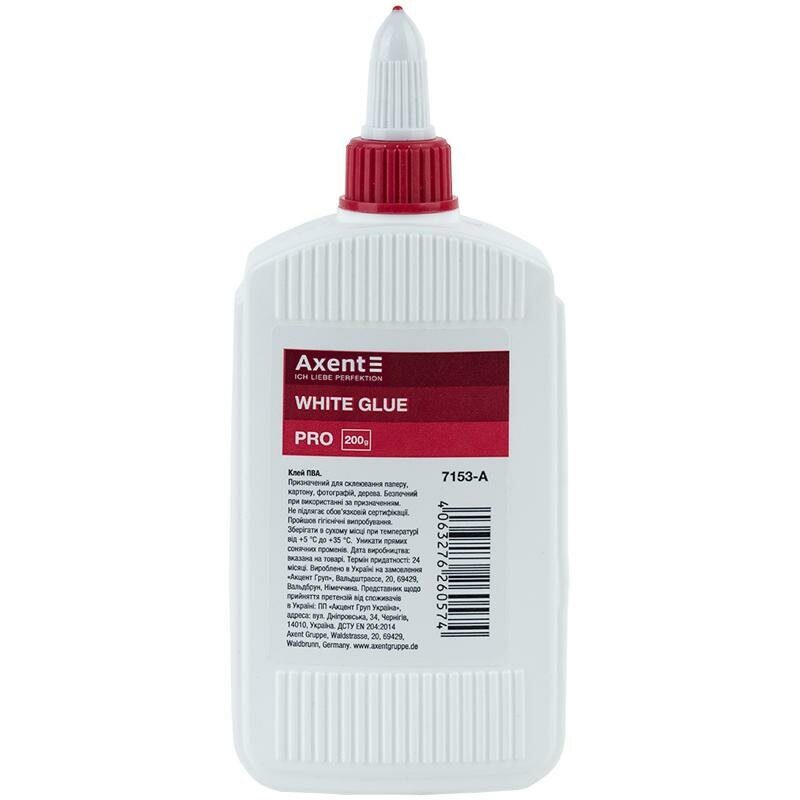 Клей ПВА Axent PRO використовується для склеювання паперу, картону, фотографій, тканини і дерева. Ковпачок-дозатор регулює подачу клею та запобігає його висиханню, дозволяє наносити клей краплями або тонкою лінією. Не токсичний, змивається водою. Об'єм 200 мл.