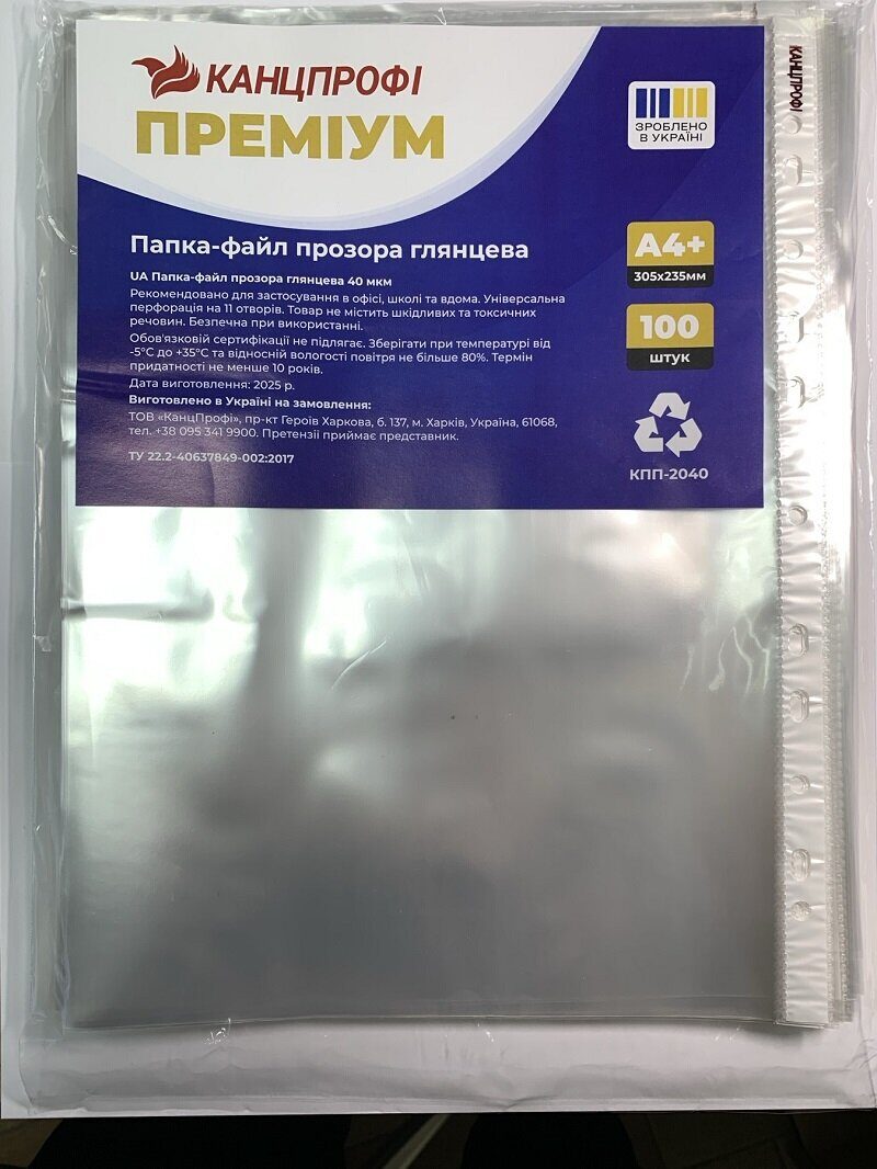 Главная Приладдя для діловодства Файли та системи Файл для документів А4+ "КАНЦПРОФІ ПРЕМІУМ" (100шт/уп.) (20)